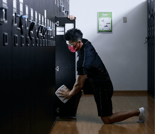 通常の清掃以外にもクリーンタイムを設け、ウイルスの不活化に効果があるアルコールでの消毒も実施。換気も徹底し、トレーニングルームやロッカールームなどの施設を安全に保ちます。
